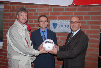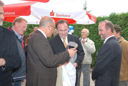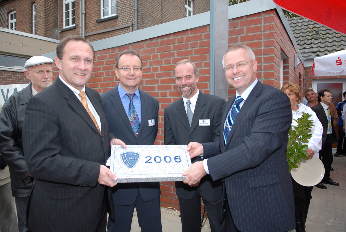 Der Oberbürgermeister der Stadt M-gladbach, Herr Norbert Bude und der Sportausschussvorsitzende Herr Frank Boss übergaben eine Gedenktafel an den Vorsitzenden des Gesamtvereins Paul-Theo Leuchtgens und an den Fußballabteilungsleiter Reimund Esser. Gemeinsam wurde die Tafel angebracht und damit das Gebäude dem SV Schelsen übergeben. Herr Bude und auch Herr Boss würdigten in ihren Reden das überaus große Engagement des Vereins bezügl. der in Eigenleistung renovierten Außentoiletten, des Clubhauses und des gesamten Außenbereiches.