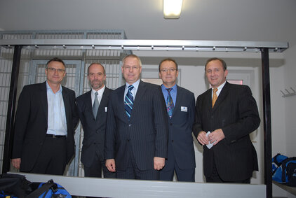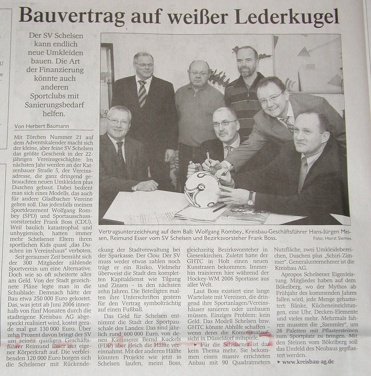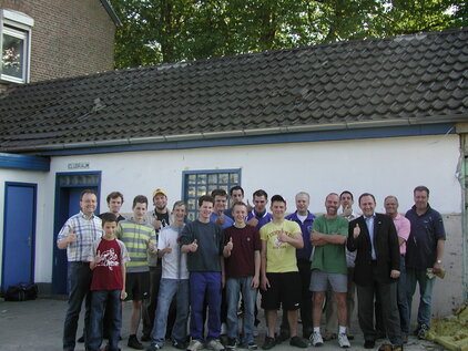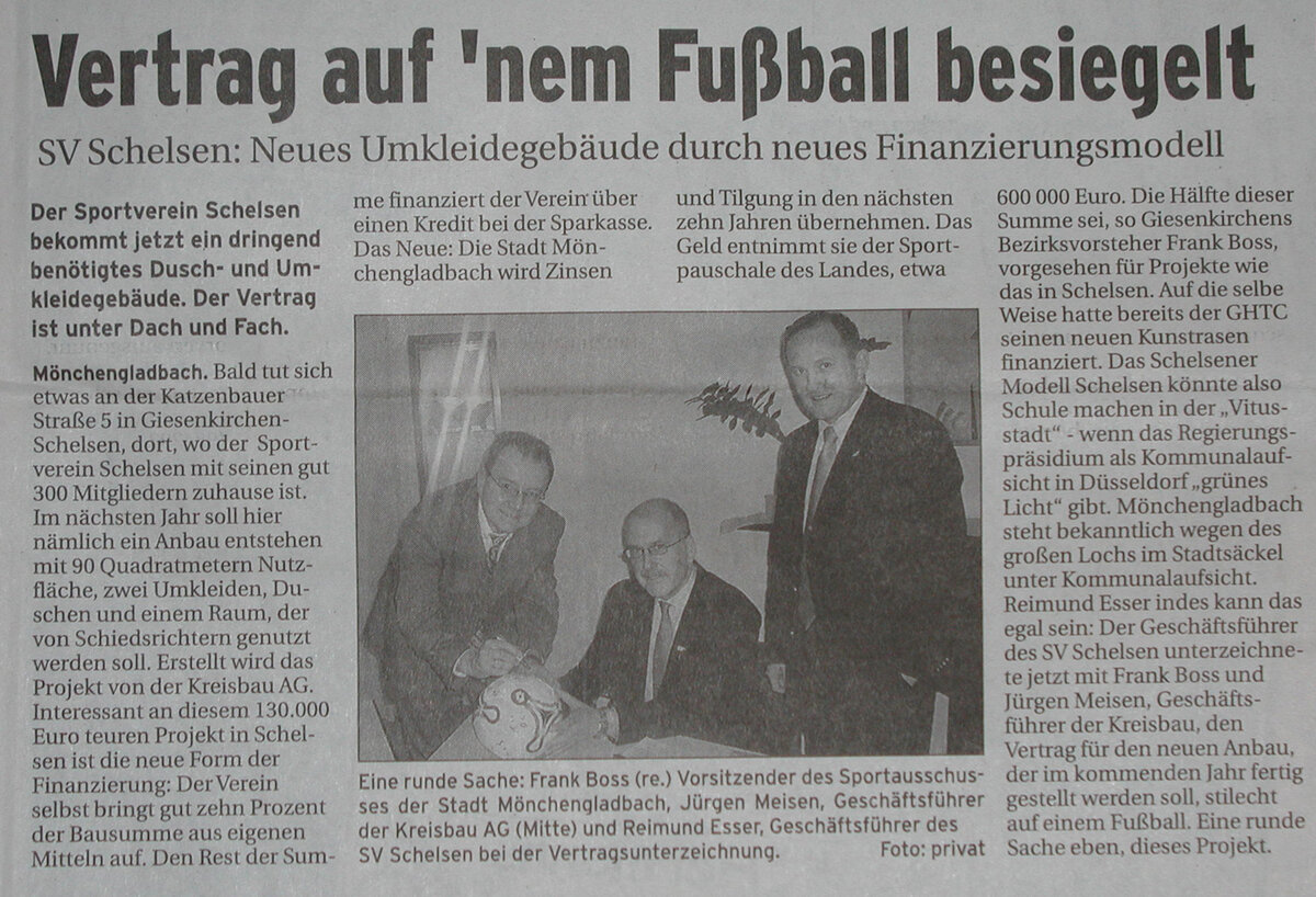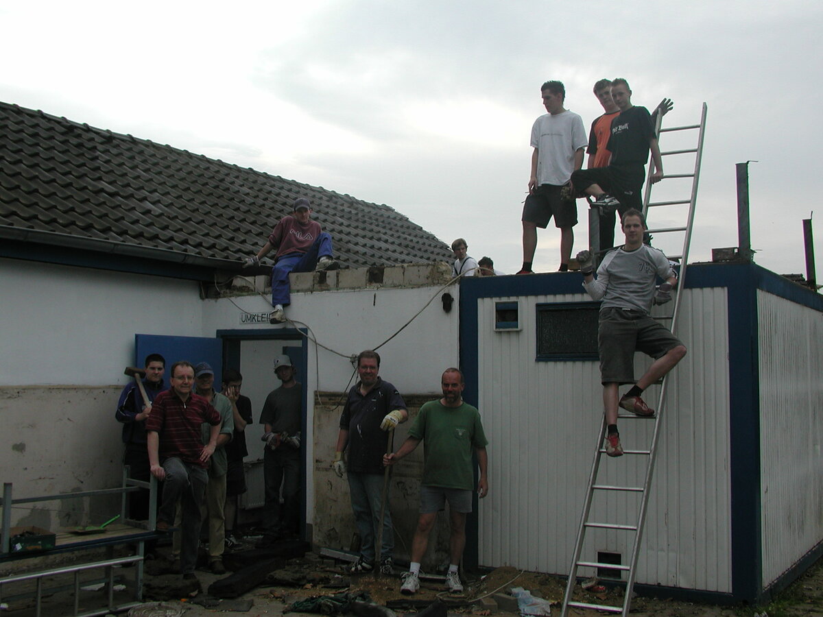 Der damalige Bezirksvorsteher und Sportausschussvorsitzender der Stadt Mönchengladbach, Frank Boss, hatte sich vehement für die Belange unserer Fußballabteilung eingesetzt und es geschafft, dass u.a. über ein neues Finanzierungsmodell der Stadt der Bau in Angriff genommen werden konnte. Unterstützt wurde unser Anliegen von der gesamten Bezirksvertretung Giesenkirchen, die sich u.a. bei einem Lokaltermin am 02. März 2004 ein Bild vom katastrophalen Zustand unseres alten Duschcontainers gemacht hatte, der ursprünglich als Provisorium geplant war und doch so viele Jahre seinen Dienst tat.