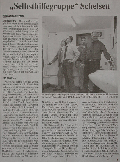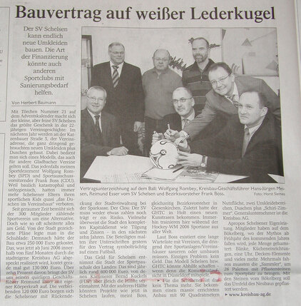 Nach nur 5 Monaten Bauzeit wurde am Freitag, den 27.10.2006 das neue Dusch- und Umkleidegebäude des SV Schelsen fertig gestellt und an den SV Schelsen übergeben. Ebenfalls präsentierte sich der vom Verein in Eigenleistung neu gestaltete Jugendlehrraum mit den Sanitäranlagen in neuem Glanz.
