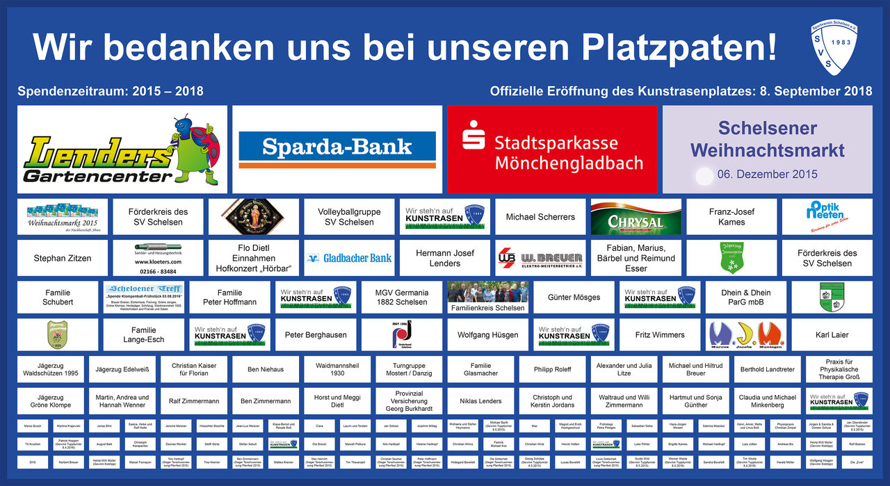 Der Sportausschuss der Stadt Mönchengladbach hatte in der Sitzung am 19.11.2014 beschlossen, dass der Sportverein Schelsen im Jahr 2017/18 ein modernes Kunstrasenspielfeld mit Flutlicht auf dem Gelände des jetzigen Sportplatzes erhalten wird. Hierzu ging ein großes Dankeschön an alle Politiker und die Vertreter der Stadt M-gladbach, die sich für dieses Projekt eingesetzt hatten. Ohne zahlreiche Gespräche, Ideen und Planungen wäre dieser Entschluss so nicht getroffen worden. Voraussetzung hierzu war allerdings, dass der Verein sich mit einer Eigenleistung in Höhe von 100.000 € an der Finanzierung beteiligte. Bei ähnlichen Bauprojekten war dies, auch in anderen Kommunen, durchaus üblich. Wir als SV Schelsen waren uns dieser Mammutaufgabe zur Aufbringung des Geldbetrages im Vorfeld bewusst gewesen und hatten dies von vornherein befürwortet. Nun freute sich der SV Schelsen auf ein historisches Projekt: „Wir steh'n auf Kunstrasen“. Der SV Schelsen konnte (…und kann heute immer noch) eine Menge bewegen, brauchte aber nicht nur die Unterstützung der Mitglieder, sondern auch die der Freunde, der Sponsoren und die der Schelsener Bürger.