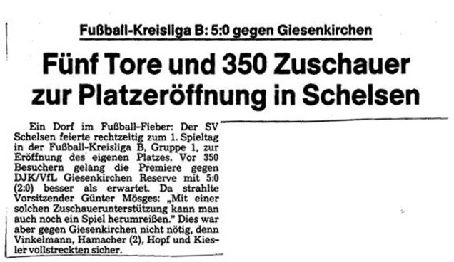 H. A. Jansen, federführend für den Sportplatzbau in Schelsen, erhielt seinerzeit einen städtischen Zuschuss in Höhe von 25.000,00 DM. Die Gesamtkosten der Baumaßnahme waren damals auf 80.000,00 DM festgelegt. Der daraus entstandene Differenzbetrag musste in Eigenleistung erbracht werden. Zum Baubeginn fällten Landwirte und die Aktiven des Vereins Bäume und entfernten gleichzeitig die alten Betonpfosten. Mit den entsprechenden technischen Hilfsmitteln wurde dann enorm viel Erdreich bewegt, wobei über 200 Lkw-Ladungen an Erd-Sand-Gemisch auf dem Gelände verarbeitet wurden. Nach der Feineinebnung und der Raseneinsaat setzte H. A. Jansen mit seiner Truppe die Pfosten für den Ballfangzaun. Mit dem Einhängen der Ballfangnetze und dem Aufstellen der Aluminiumtore war das Bauvorhaben soweit abgeschlossen. Wegen der Schonfrist für die Rasenspielfläche mussten die Sportler dennoch ein Jahr auf das Eröffnungsspiel am 8. September 1986 warten.