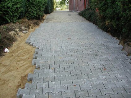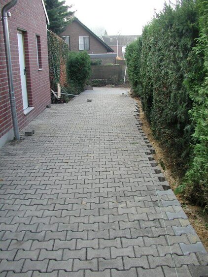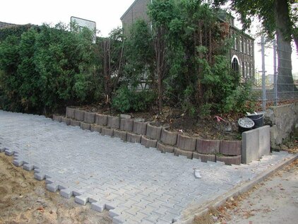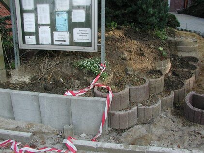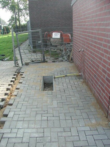 Durch den Neubau des Umkleidegebäudes musste der Außenbereich, d.h. der Aufgang zum Clubhaus und die Fläche vor Clubhaus, Toiletten und Duschgebäude neu gepflastert werden.